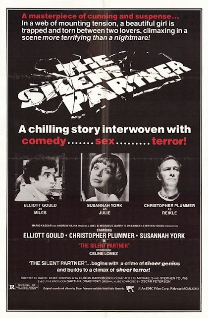 Here is a fine genre exercise, dated in only the best ways! (Candy, for example, is quite svelte!) There could stand to be a little less of the relationship between Gould and banking colleague Susannah York, but it pays off in the end, and makes the picture richer! The young and lovely Francophone who makes sweet love to Gould later in the picture is not the greatest performer ever, but she does okay! In sum, this is a movie worth your while, especially at this time of year! I give The Silent Partner three deceased angelfish!